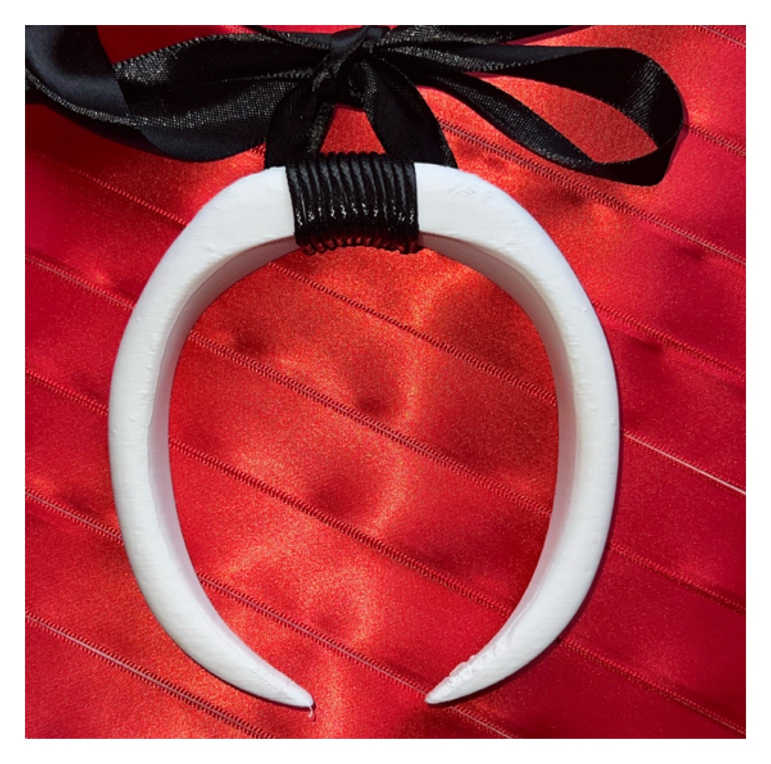 An accessory worn on the upper arm or as a neck adornment, used by both male and female. Available in 2 colours - Ivory pearl and milky white. Ties are 80cm long in black satin ribbon that are wrapped and bound in a 2mm wax cord
